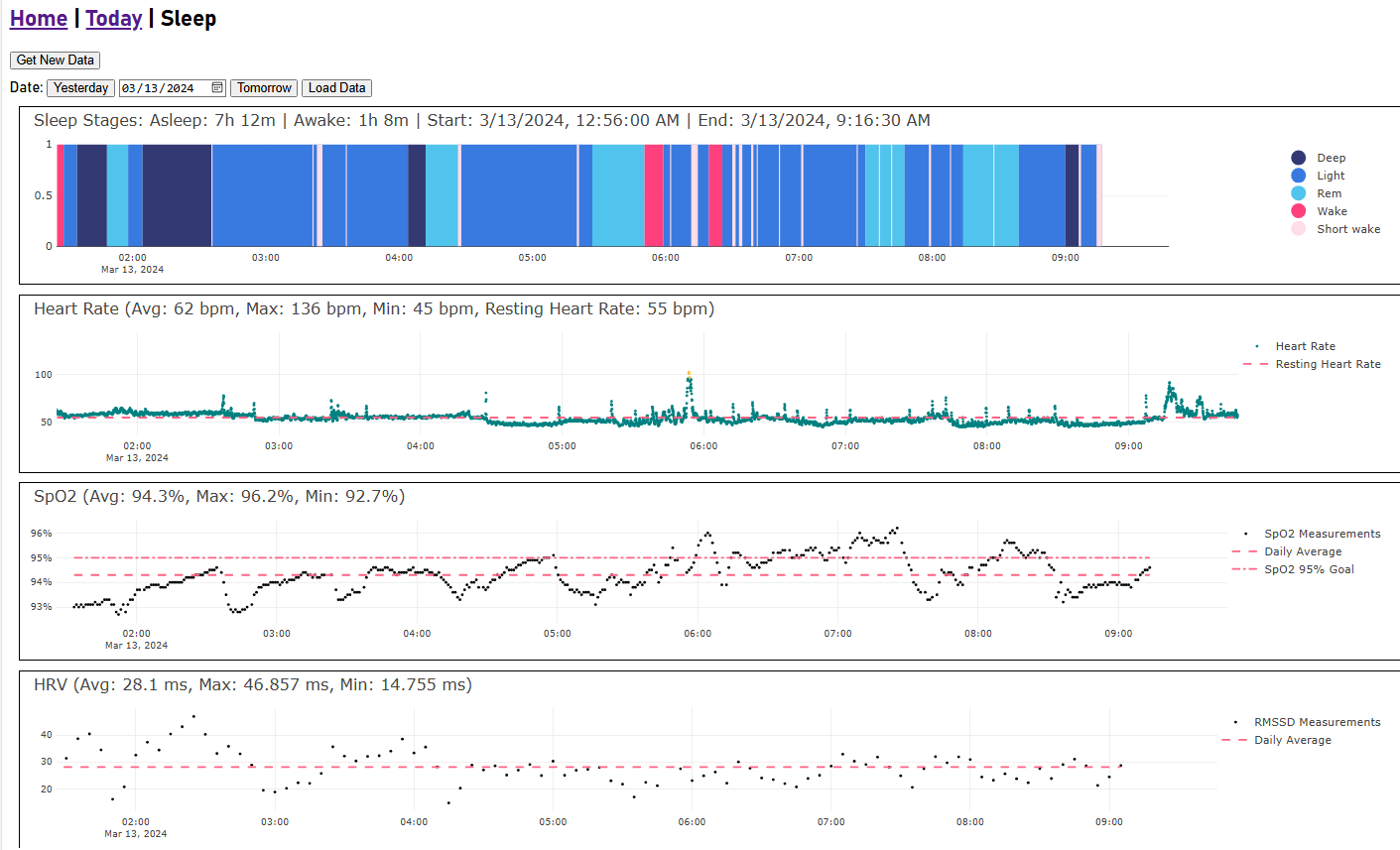 Dive deep into your sleep patterns with comprehensive breakdowns of sleep stages, breathing rate, SpO2, and HRV during rest.